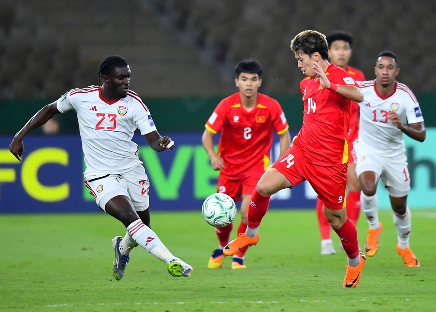 Lê Viktor (số 14) được yêu cầu kiểm tra doping sau trận U23 Việt Nam thắng U23 UAE. Ảnh: AFC