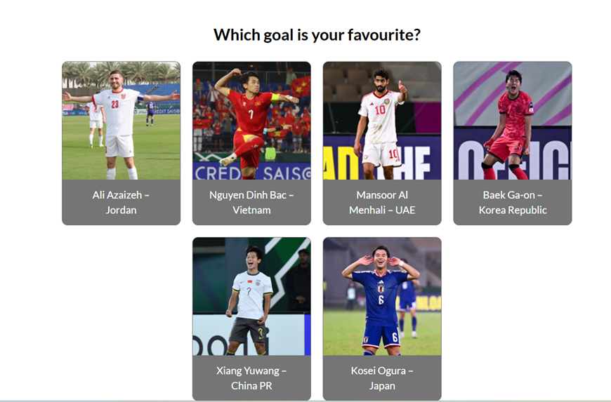Ngày 28-1, trang chủ Liên đoàn Bóng đá châu Á (AFC) có bài viết với tiêu đề: “Hãy bình chọn cho bàn thắng đẹp nhất vòng loại trực tiếp Giải bóng đá U23 châu Á 2026”.