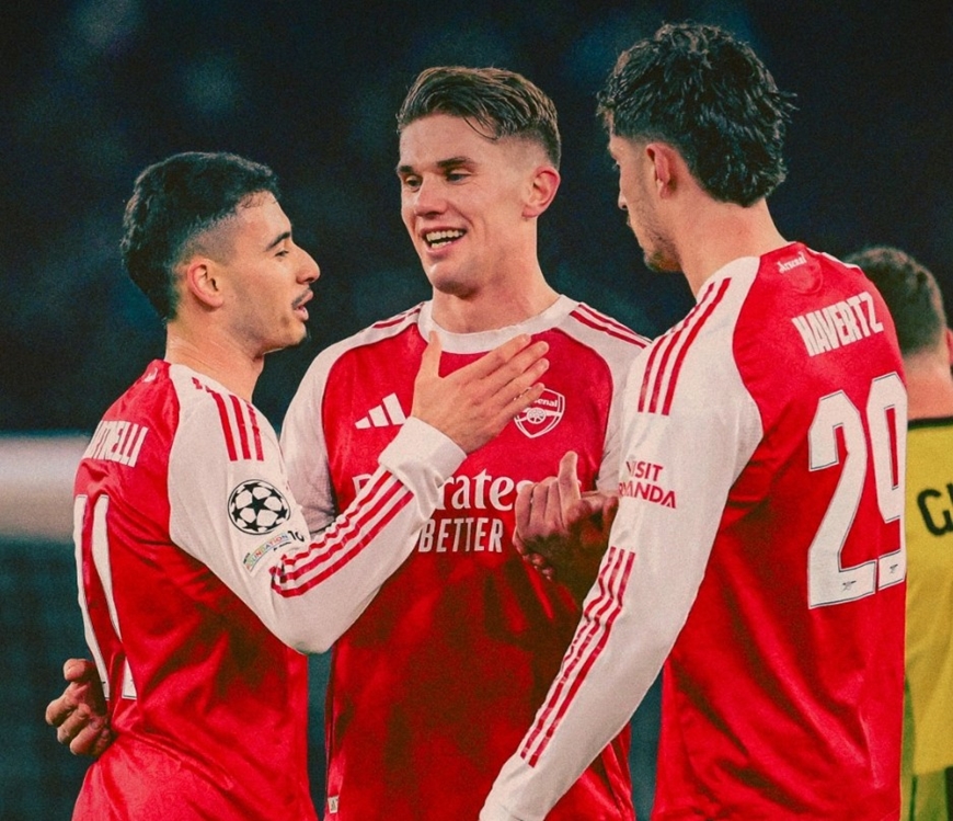 Các cầu thủ Arsenal mừng chiến thắng 3-2 trước Kairat Almaty, khép lại vòng phân hạng UEFA Champions League 2025-2026 với thành tích 8 trận toàn thắng. Ảnh: Arsenal FC